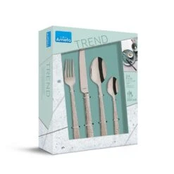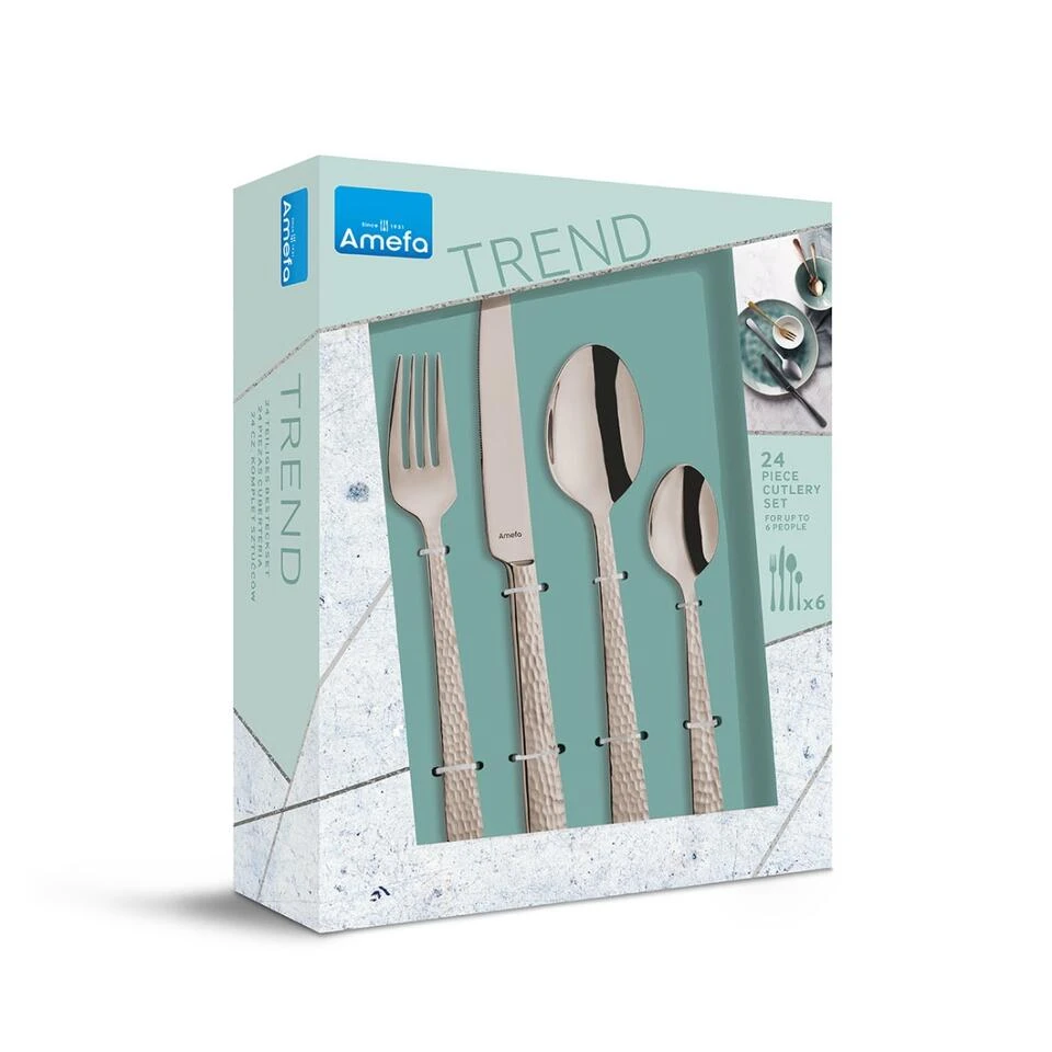 Felicity bestek van Amefa brengt het gevoel van eigentijds handwerk op tafel door de grove, gehamerde decoratie op het heft. De gekleurde hoogglans afwerking geeft een stijlvolle en moderne twist aan elke tafelsetting. De gehamerde decoratie op het handvat zorgt voor een mooie reflectie op het bestek waarbij de glans perfect tot zijn recht komt.<br><br>Deze 24-delige bestekset bestaat uit:<br><br>