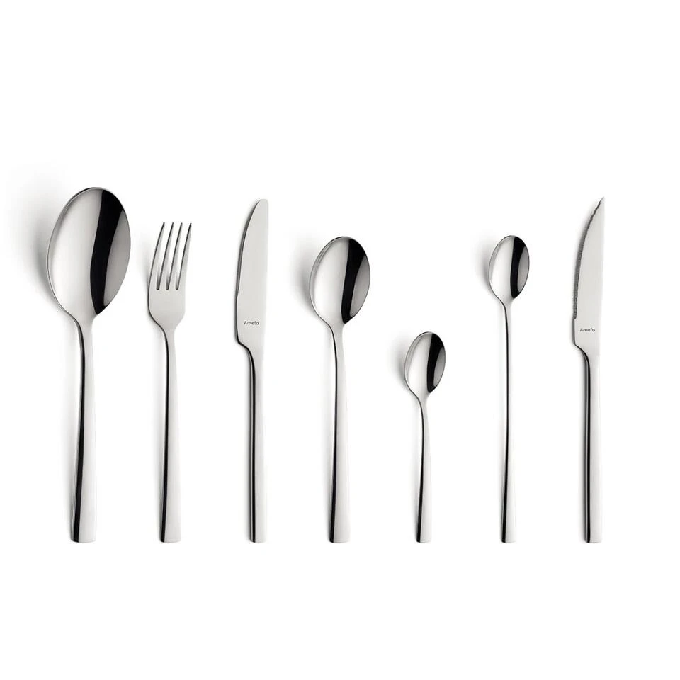 Het Manille bestek van Amefa heeft met zijn slanke en platte handvatten een strakke en moderne uitstraling. De hoogglans afwerking zorgt ervoor dat je het kan combineren met verschillende stijlen en materialen. <br><br>Hoe je maaltijd er ook uit ziet – vroeg in de ochtend of laat op de avond, zelfgemaakt of zelf besteld, snelle hap of uitgebreid tafelen – deze bestekset bevat alles wat je nodig hebt voor 6 personen. Naast het gebruikelijke mes, vork en lepel haal je met deze set ook meteen bijpassende steak-/pizzamessen, ijs-/latte lepels, koffielepeltjes en serveerlepels in huis. Dus hoe of wat je ook eet, deze bestekset is “All You Need” en bestaat uit:<br><br>