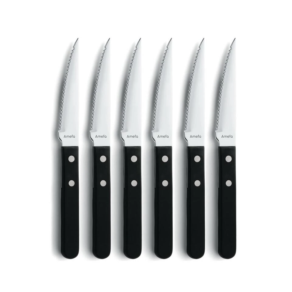 Een fijn Amefa steakmes voor dagelijks gebruik, een gezellig etentje of een zomerse barbecue. Deze messen zijn traditioneel gevormd met een geklonken handvat. Door de fijne kartels zijn ze vlijmscherp, waardoor je moeiteloos door ieder stuk vlees, vis of vega snijdt. De tijdloze vormgeving en het duurzame ontwerp zorgen ervoor dat je er jarenlang plezier van hebt.