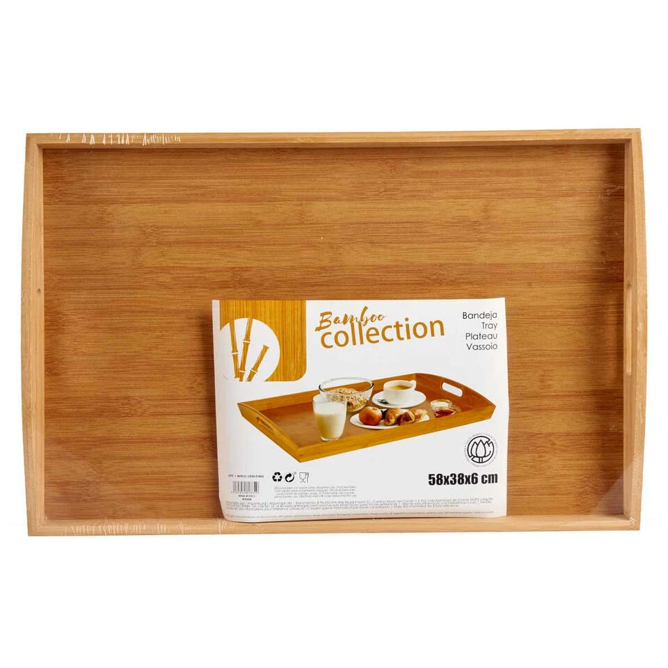 Rechthoekige bamboe houten dienblad met handvaten 58 x 38 x 6 cm. Het dienblad is voorzien van een opstaande rand met twee handvaten waardoor het gemakkelijk op te tillen en te verplaatsen is.