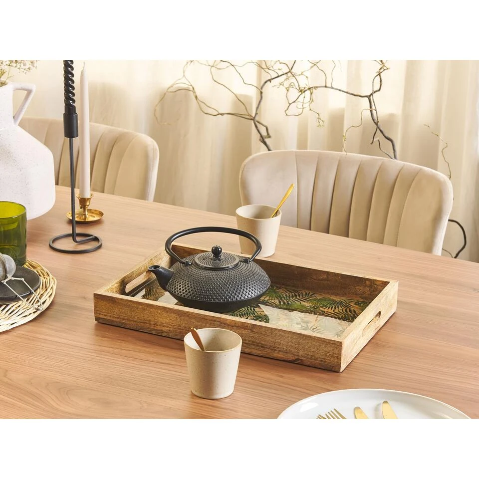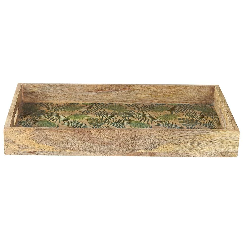 Houten Trinket Dienblad. Dit kleine houten dienblad is een perfect accessoire voor je theekransje of een mooi snuisterijschaaltje voor alle kleine stukjes en beetjes. Gemaakt van mangohout en verfraaid met bladerenpatroon, zal het een aanvulling zijn op elk interieur. Breng het naar huis om een stijlvol tintje te geven aan je tafelblad of planken.