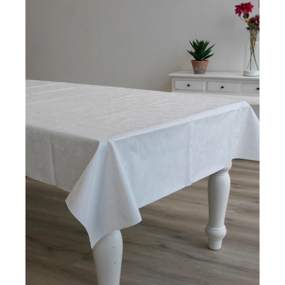 Tafeldecoratie zeil met bloemen motief in het wit. Afmeting: 140 x 220 cm. Het tafelzeil valt het mooiste rondom een tafel van 100 x 180 cm, zorg bij een grotere tafel voor een minimale overhang van 10 cm aan alle zijdes. Materiaal: PVC met zachte non-woven vliesrug. 100% waterdicht en valt soepel rondom de tafel. Enkel afnemen met een vochtige doek, geen schoonmaakmiddel gebruiken dit zal de print aantasten. Langdurige blootstelling aan diverse weersomstandigheden zal de print ook aantasten en/of doen verkleuren. Geschikt voor zowel binnen als buitenshuis.