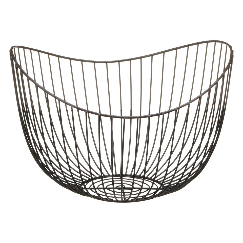 Metalen fruitmand/fruitschaal zwart rond 31 x 21 x 29 cm. De open rand/wand zorgt voor een constante luchtcirculatie waardoor het fruit minder snel overrijp is. Materiaal: metaal. Reinigen: afnemen met een vochtige doek.