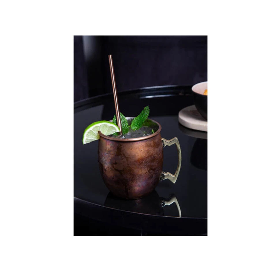 Cocktailbeker van antiek koper met een handvat. Perfect om de geliefde klassieke Moscow Mule cocktail, op basis van wodka en gemberbier, in te serveren. Materiaal: koper (metaal). Formaat diameter: 8,5 cm, hoogte: 10 cm. Inhoud: 450 ml/45 cl. Koperen cocktailglazen.