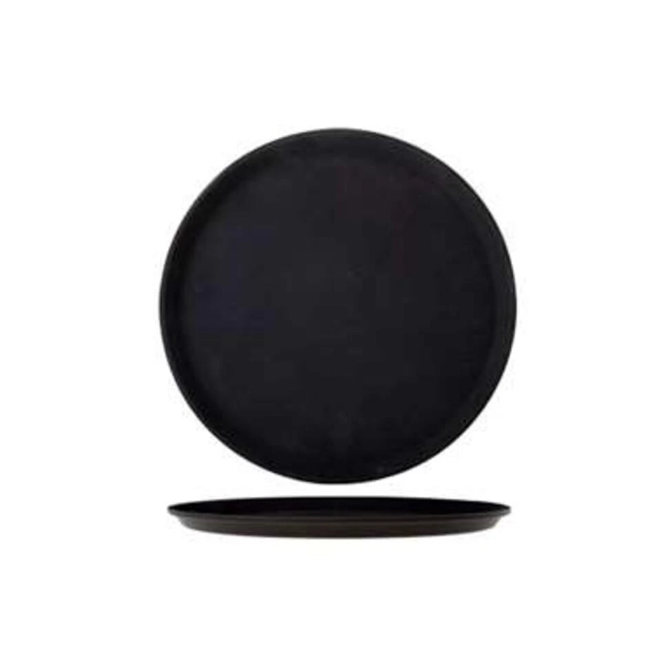 Dienblad met een doorsnede van 35,5 cm. Anti slip, heeft de kleur zwart en is van het materiaal kunststof met anti slip laag.. Door het anti-slip materiaal van het hele blad blijven de glazen stabiel en vallen er minder glazen om als je hiermee loopt en serveert.