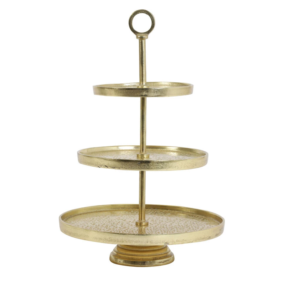 Een etagère op tafel zorgt meteen voor sfeer aan tafel. De Lutek etagère heeft precies de goede maten om gezellig op tafel te staan en heeft 3 lagen. Leg er hapjes op of wat kaarsjes en geef je tafel net dat extra feestelijke gevoel. De etagère heeft een gouden kleur en is gemaakt van het metaal. De onafgewerkte details en het reliëf van de etagère maken hem super uniek. De bladen hebben een gatenpatroon wat voor een stoer effect zorgt. Hierdoor zou hij ook geweldig staan in een strak en modern interieur. De afmeting van de etagere is 32 x 32 x 48 cm. Door het handvat bovenop is de etagère makkelijk te verplaatsen en op te pakken. Deze etagere is niet geschikt voor de vaatwasser.