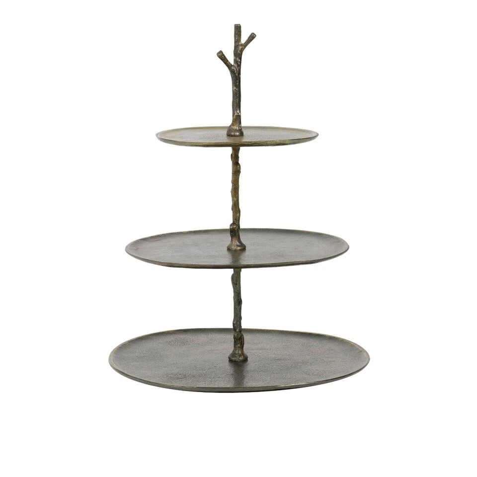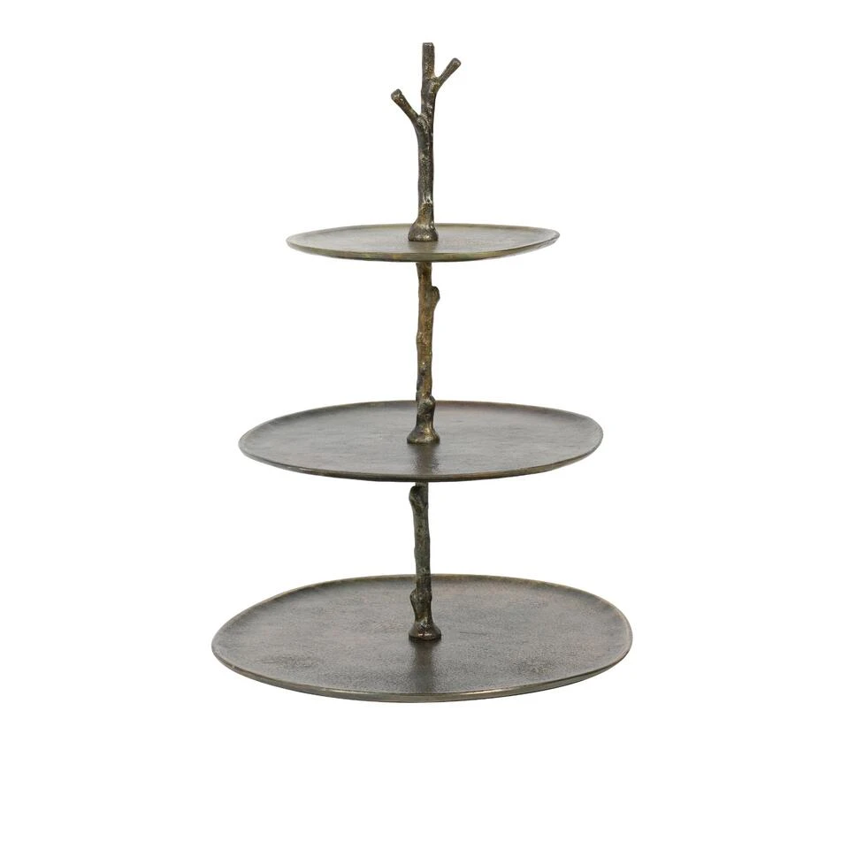 Etagères zijn multi functioneel. Leuk voor het serveren van lekkere hapjes en diverse zoetigheden zoals, koekjes en taartjes. Deze moderne etagère is perfect voor wanneer je visite krijgt. Deze antiek bronzen etagère met 3 lagen zal ook leuk staan op je eettafel met woonaccessoires, zoals theelichthouders. Dankzij de ruwe afwerking en de boomstam look valt hij extra op. Etagère Tresa van het merk Light & Living is gemaakt van metaal en heeft een hoogte van 45 cm en heeft een maximale breedte van 35 cm. (Niet geschikt voor in de vaatwasser)