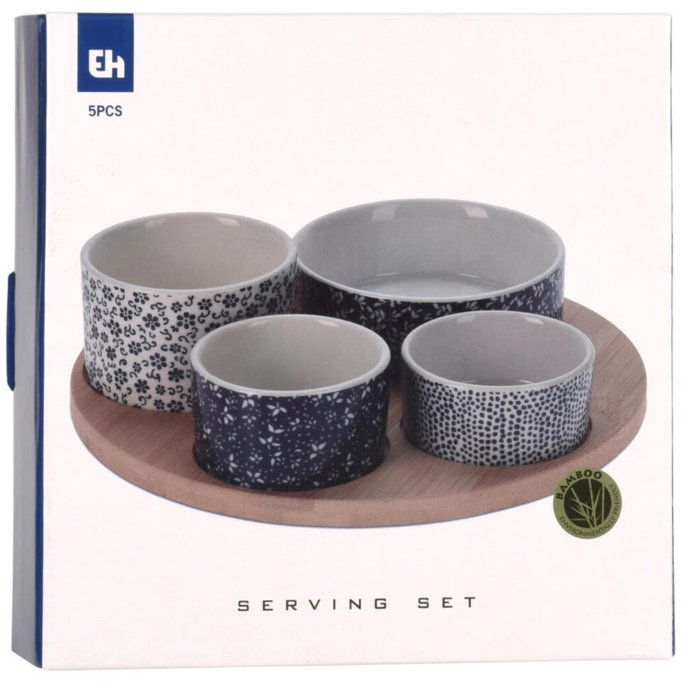 Serveerplank/borrelplank voor hapjes/saus/tapas porselein donker blauw inclusief 4x schaaltjes. Serveer je gerechten met deze mooie set tijdens diner of borrel. Afmeting plank: ca. D22.5 x H6 cm. Materiaal: porselein/bamboe. Het aardewerk is vaatwasser bestendig. Merk: Excellent Houseware. Snack- en tapasschalen. Etenswaren bakjes, kommetjes, kleine schaaltjes.