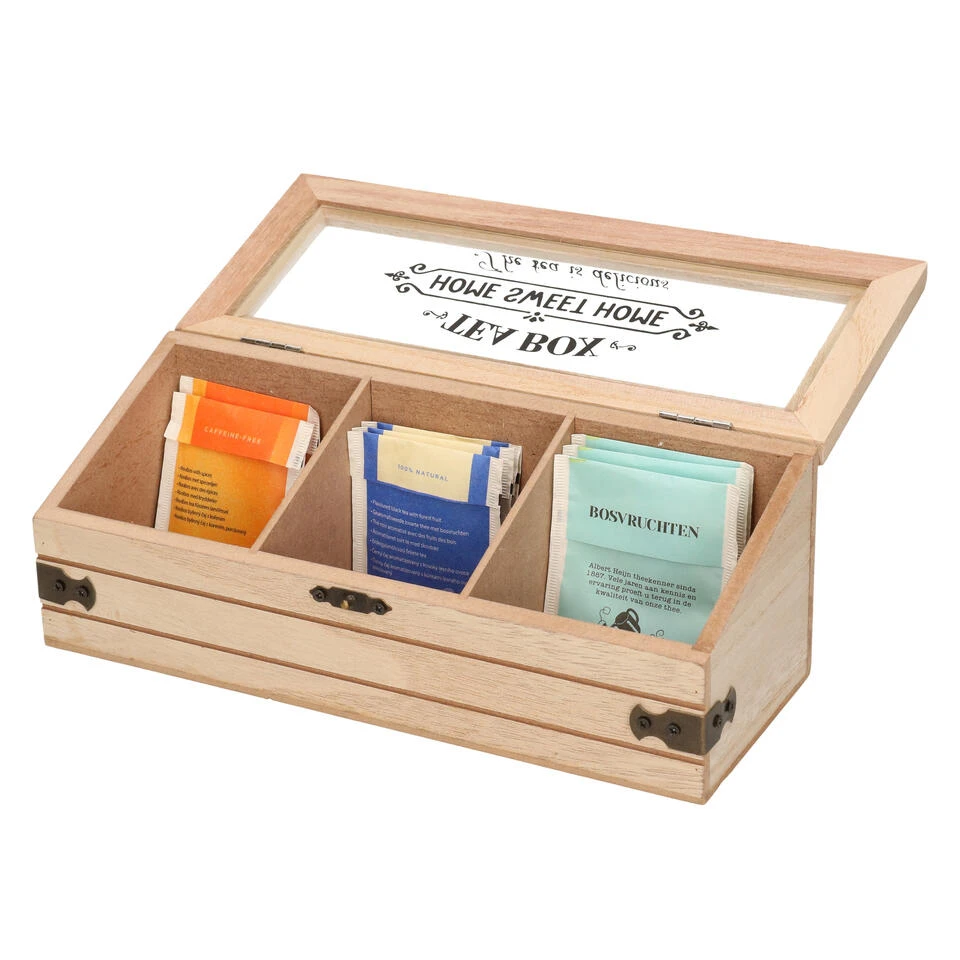 Houten theedoos/theekist bruin met mdf bodem met 3 vakken 24 x 9 x 9 cm. Vierkante 3-vaks theedoos voor het bewaren van diverse soorten thee/theezakjes. Met doorzichtig deksel met metalen hoekbeslag, metalen sluiting en de teksten ‘Teabox’ en ‘Home Sweet Home’ en ‘The Tea is Delicious’ op het glazen deksel. De theedoos loopt schuin af van achter naar voren.