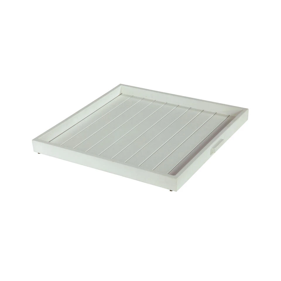 Het James dienblad is vervaardigd uit aluminium. Het aluminium is voorzien van een hoogwaardige kwaliteit poedercoating in de kleur wit. Deze coating is dusdanig sterk dat het kras- en stootvast is. Het dienblad is geschikt om buiten te laten liggen, ook als het regent.