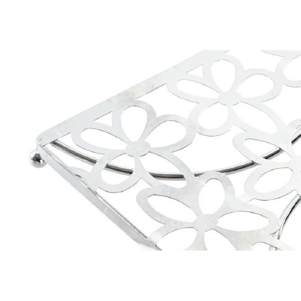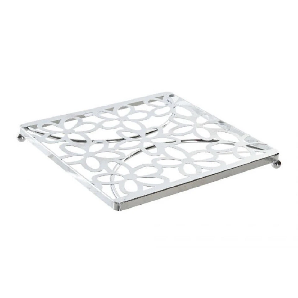 1x stuks metalen zilveren pannenonderzetters vierkant met bloemenprint 18 cm. De zilveren onderzetter staat ca. 1,5 cm boven de tafel, waardoor de tafel niet wordt geraakt.