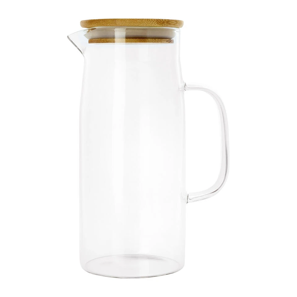 De karaf zelf is gemaakt van glas, net als het slanke en elegante handvat. Het deksel op de karaf is gemaakt van hout, wat zorgt voor een mooi effect. De glazen karaf met houten deksel en handvat heeft geen filter, maar het deksel houdt grotere stukken fruit tegen.