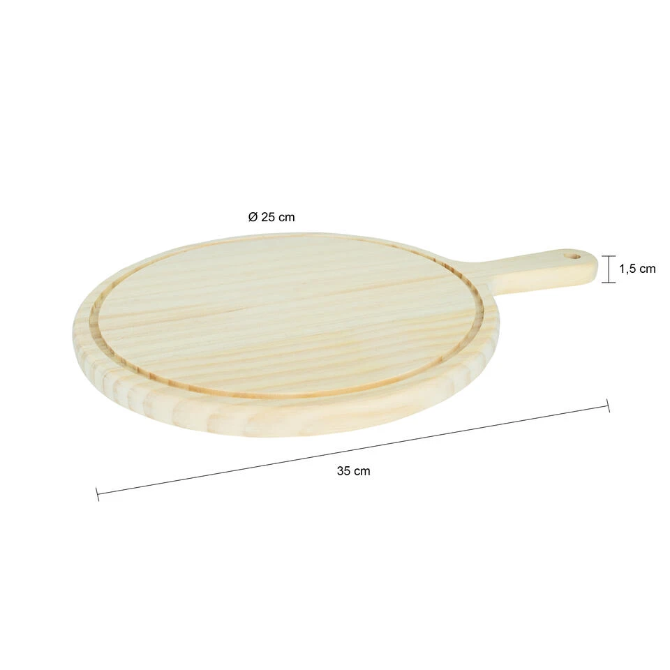De tapasplank is ook in twee andere formaten verkrijgbaar. Deze borrelplank heeft een diameter van 20 centimeter, maar je kunt ook kiezen voor modellen van 15 en 20 centimeter. Op deze borrelplank kun je bijvoorbeeld ook pizza serveren.