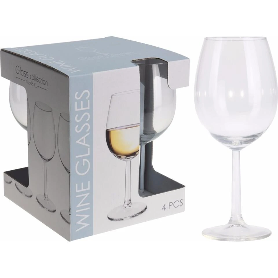 4x Wijnglazen transparant voor verschillende soorten wijn. Inhoud: 430 ml (43 cl). Geschikte dranken: water/wijn/bier en whiskey. U ontvangt in totaal 4 stuks.