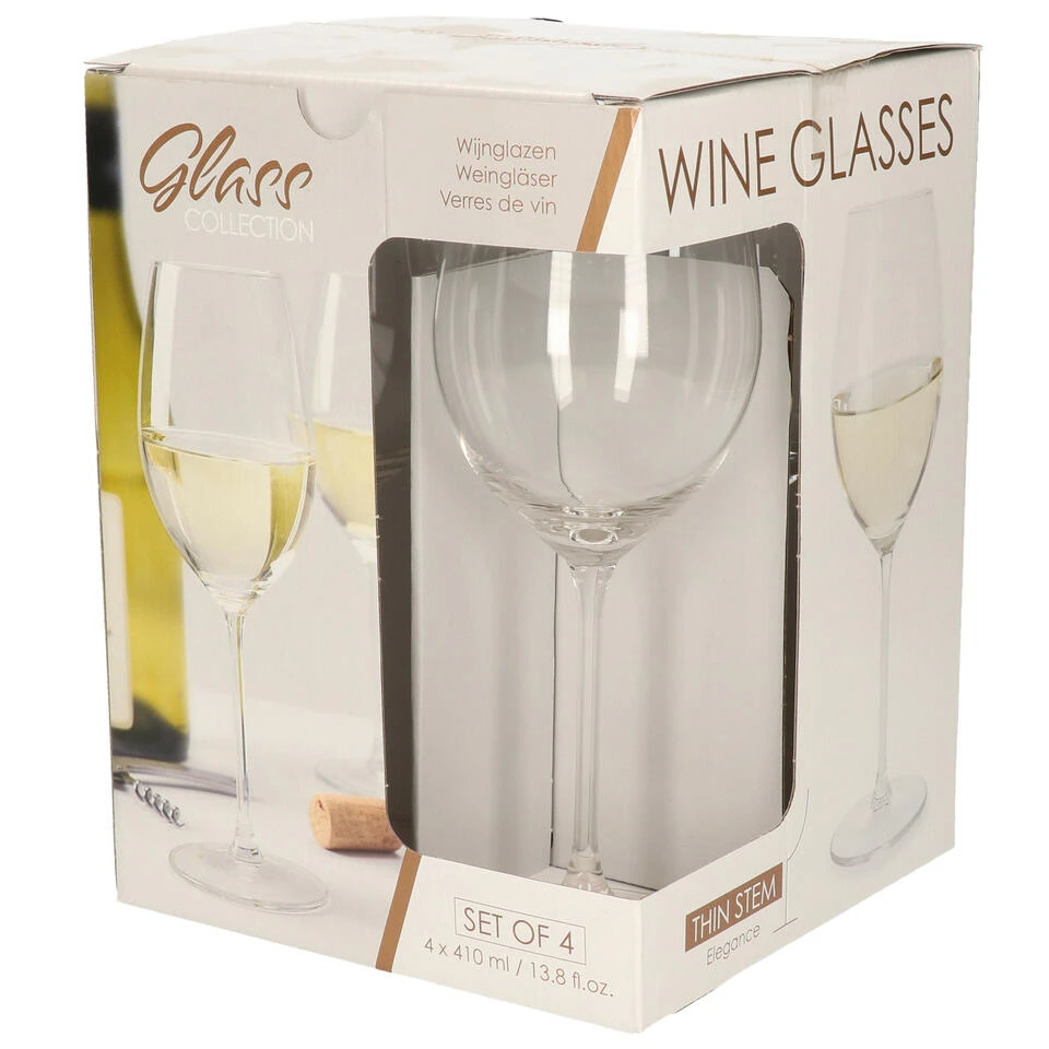 Set van 4x stuks wijnglazen. Inhoud per glas: 410 ml. Afmeting per glas: D7 x 22 cm. Geschikt voor in de vaatwasser.