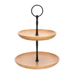 Deze etagère heeft twee houten schaaltjes. De onderste schaal is wat groter dan de bovenste. De schaaltjes zitten vast aan een stalen frame. Dit frame is zwartkleurig en contrasteert mooi met het hout van de schaaltjes. Aan de bovenkant van het frame zit een handig handvat. Hiermee verplaats je de serveerschaal moeiteloos, zelfs als de schaaltjes vol lekkers liggen. Dat wordt genieten!