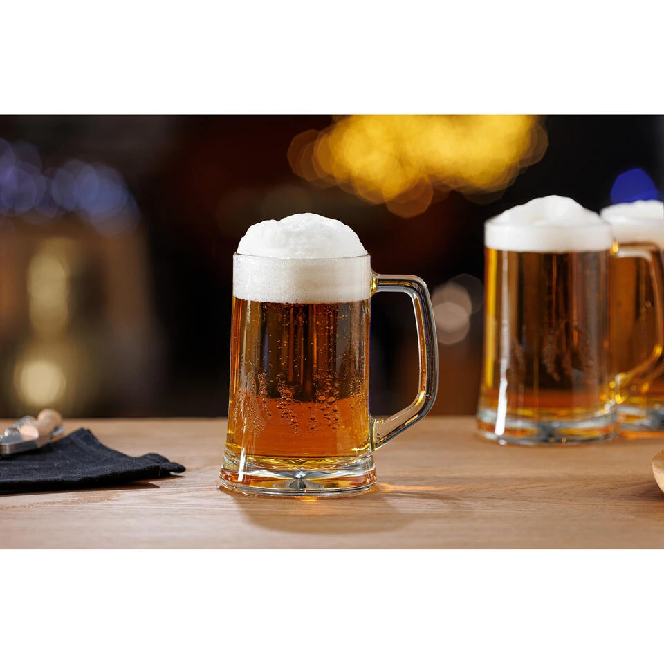 Set van 4x stuks bierglazen/bierpullen. Perfect om je bier in op te drinken met een handig handvat voor extra grip. Ook leuk voor bijvoorbeeld een festival of bierfeest/Oktoberfest! Inhoud per glas 320 ml. Formaat per bierglas: 9 x 12 cm Materiaal: glas.