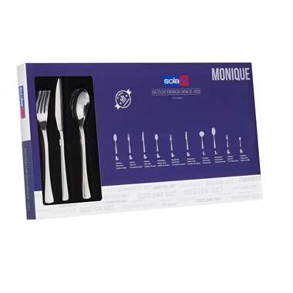 Monique is een vlotte en plezierige tafelgenote. De rechte lijnen van dit bestek gaan aan de bovenkant vloeiend over in aangenaam afgeronde vormen. Ideaal als je voor een gunstige prijs een moderne bestekset wilt aanschaffen. De Monique bestekset wordt geleverd in een fraaie cadeauverpakking.