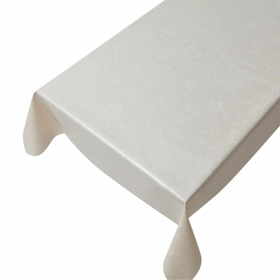 Buiten tafelkleed/tafelzeil champagnekleurig met barok motief voor binnen en buiten gebruik. Tafeldecoratie zeil in champagnekleur met barok print. Afmeting: 140 x 245 cm. Materiaal: PEVA. Type: Swirl baroque white. Enkel afnemen met een vochtige doek, geen schoonmaakmiddel. Tuintafelkleden tafeldecoraties.