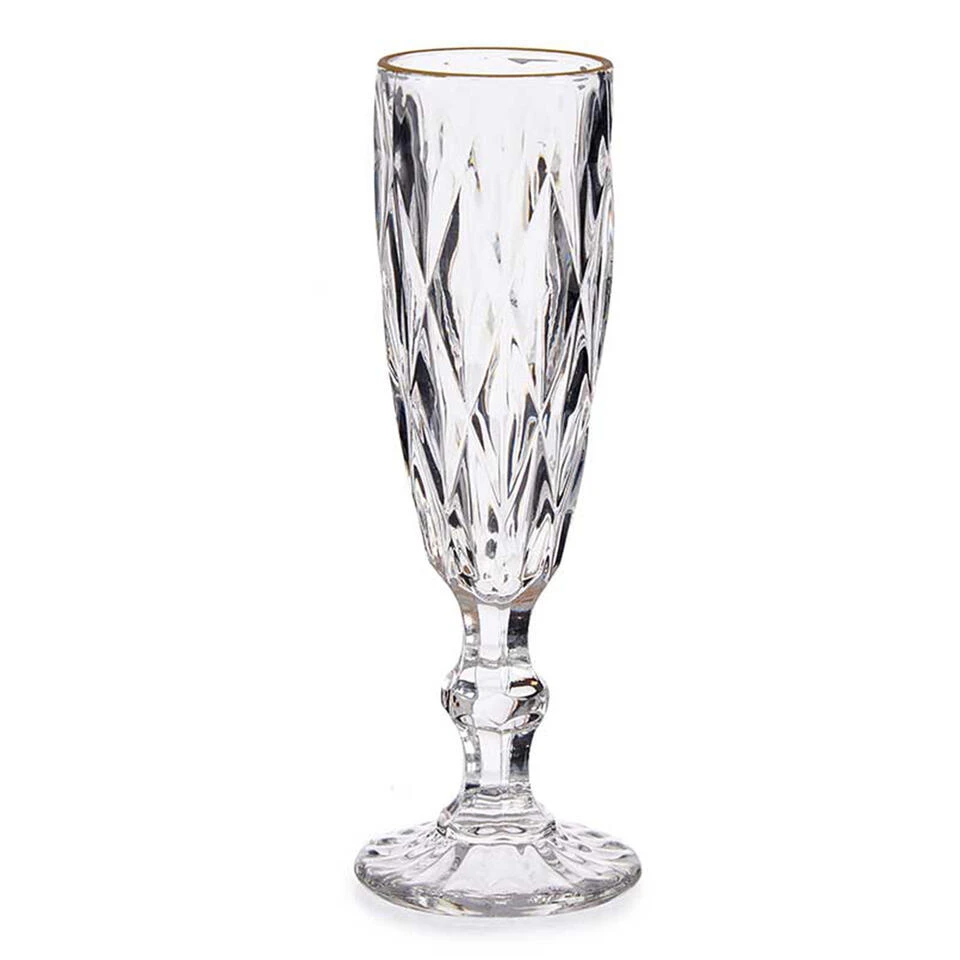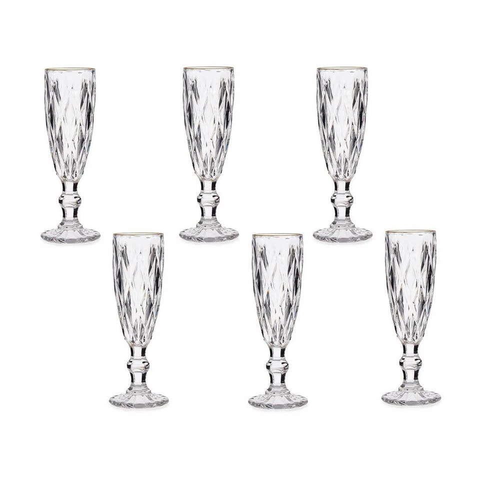 Een set met 6x stuks luxe champagneglazen. Deze mooie glazen hebben een gouden rand en hebben een kristal geslepen look. Afmetingen: 8 x 8 x 10 cm. Vaatwasmachinebestendig: ja. Materiaal: glas. Inhoud: 170 ml.