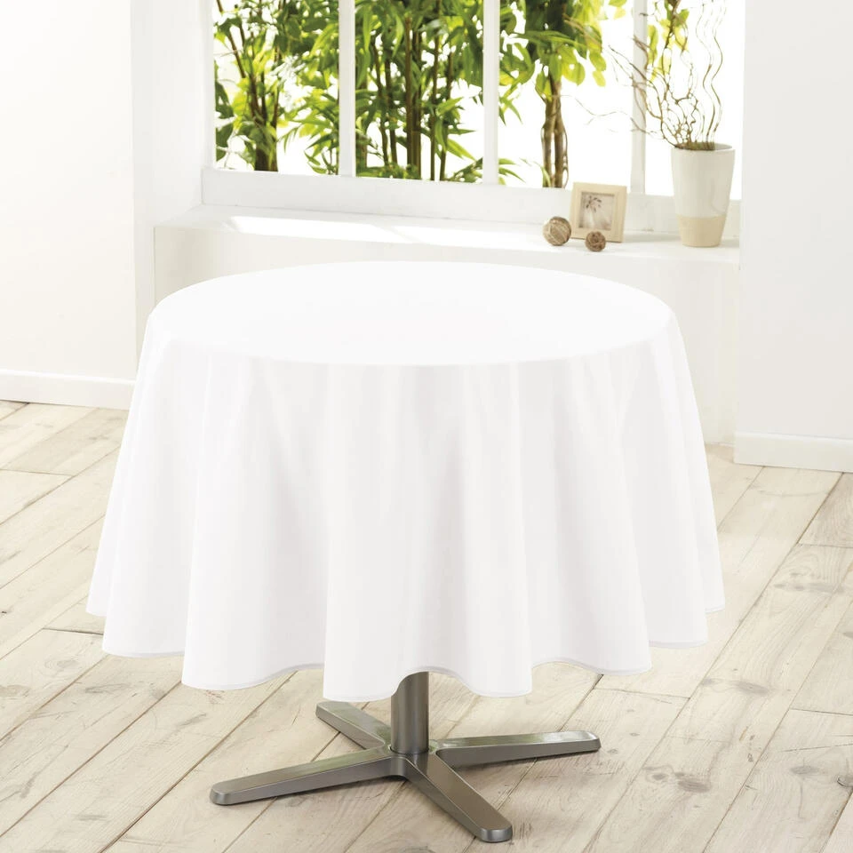 Wit tafelkleed van polyester met formaat rond 180 cm. Het tafelkleed voor ronde eettafels is mooi afgewerkt aan de randen en op 30 graden wasbaar.
