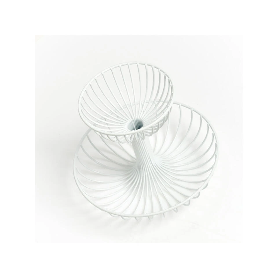 Etagere fruitschaal/fruitmand rond wit metaal 29 cm. De opengewerkte schaal zorgt voor een constante luchtcirculatie waardoor het fruit minder snel overrijp is. Afmeting: ca. D 29 x H 23,5 cm. Materiaal: metaal. Reinigen: afnemen met een vochtige doek. Fruitschalen/fruitmanden/draadmanden.