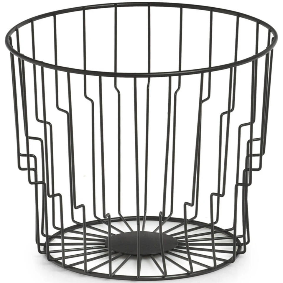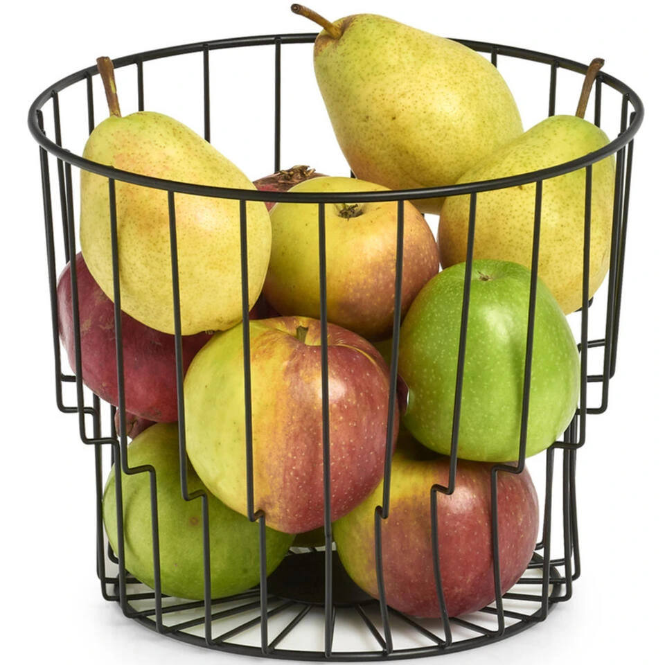 Zwarte hoge ronde fruitschaal/schalen metaal 24 cm. De deels open rand/wand zorgt voor een constante luchtcirculatie waardoor het fruit minder snel overrijp is.